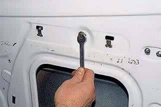 Опускаємо скло в середнє положення і головкою «на 10» відвертаємо два болта кріплення скла до кулісі склопідіймача. Піднімаємо скло у верхнє положення і фіксуємо його (наприклад, скотчем).