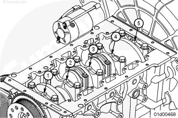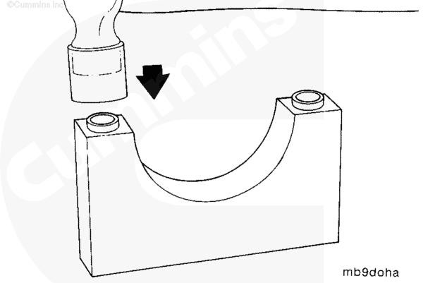 ПРИМІТКА: Встановлюйте кришку корінного підшипника після установки кожного верхнього вкладиша для його фіксації за місцем під час установки інших корінних підшипників.Нанесіть на верхні вкладиші корінних підшипників масло для складальних робіт (номер за каталогом 3163086).