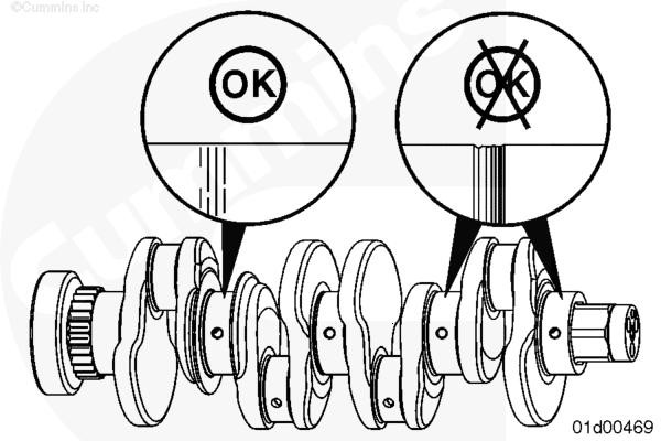 Якщо осьовий люфт колінчастого вала, виміряний під час початкової перевірки, опиниться поза норми, обов'язково перевірте його поверхню під упорний підшипник на відсутність підвищеного зносу чи пошкодження. Допускається наявність незначних подряпин.