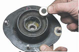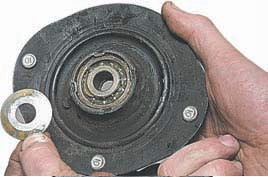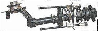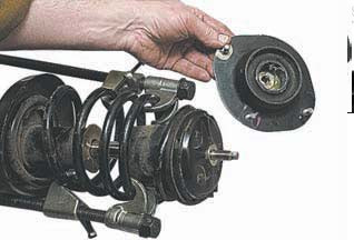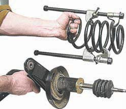 Стискаємо пружину двома стяжками, розташованими діаметрально протилежно одна одній. Після того, як пружина перестане тиснути на верхню опорну чашку, повністю відвертаємо гайку штока.