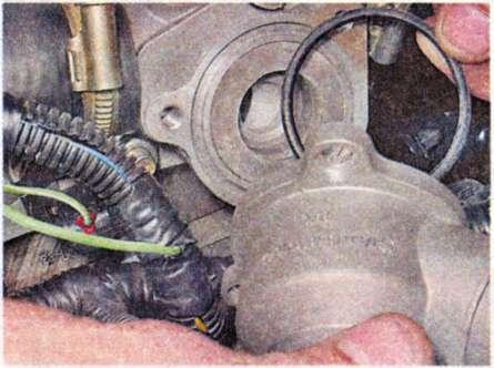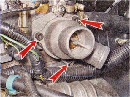 1. Для зняття термостата в зборі, від'єднуємо два шланги від патрубків кришки термостата (див. вище п. 1-4).