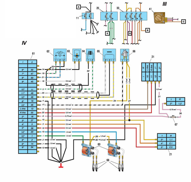 опалювача (встановлюється на частину автомобілів). Під час його встановлення жовтогарячий дріт між 33 і 41 від'єднаний. I — ланцюг; I I — контакт; I I — адреса 1* — «маса»; 2* - «+12 В АКБ»; 3* - виведення 15; 4 * - до контрольної лампи діагностики; 5* - до тахометра; 6* — загальний; 7* - питание на 62; 8 * - сигнал от 62; 9* - сигнал от 63; 10* - сигнал от 64; 11* - сигнал от 65 (+ ); 12 * - сигнал от 65 ( - ) ; 13 * - керування 66; 14* - керування 60; 15* - керування 60