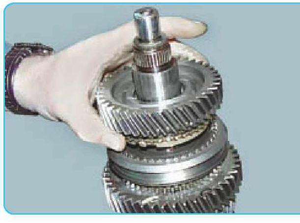 18.Зберіть вторинний вал у порядку, зворотному розбиранні, попередньо змастивши його деталі тонким шаром чистого трансмісійного масла. Зверніть увагу на те, щоб при складанні сухарі синхронізаторів увійшли в пази блокуючих кілець. Кульковий підшипник необхідно напрессовать на вал прикладаючи зусилля тільки до внутрішнього кільця підшипника.