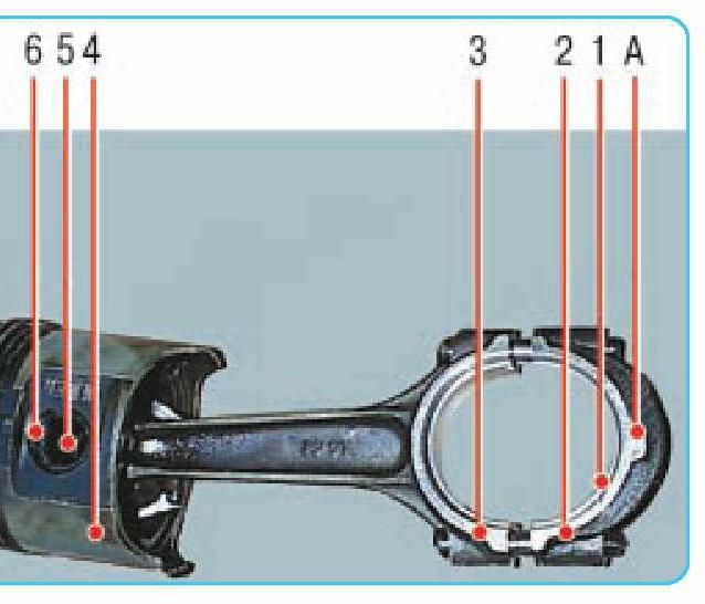 Зберіть поршень 4 з шатуном 3. Для цього нагрійте поршень до температури 60-80 °С. Потім швидко вставити шатун в поршень так, щоб напис «ПЕРЕД» на поршні і мітка «24» на шатуні були з однієї сторони, і запрессуйте поршневий палець 6. Встановіть стопорні кільця 5. Надіньте з допомогою знімача поршневі кільця на поршень.