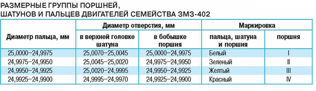 Перевірте посадку поршневого пальця у верхній головці шатуна. Зазор між пальцем і втулку верхньої головки шатуна повинен бути 0,0045-0,0095 мм. Пальці, поршні і шатуни розбиті на чотири розмірні групи і промарковані фарбою. Палець маркують на внутрішній поверхні з одного кінця, шатун - на стержні. Близько верхньої головки на днище поршня вибивають римську цифру показує групу поршня.