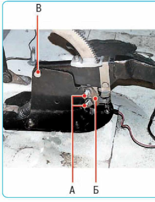 2.Відверніть дві гайки кріплення А, вийміть болти, знявши кронштейн Б з вимикачем контрольної лампи стоянкового гальма. Вийміть палець важеля, вийнявши попередньо шплінт і знявши шайбу