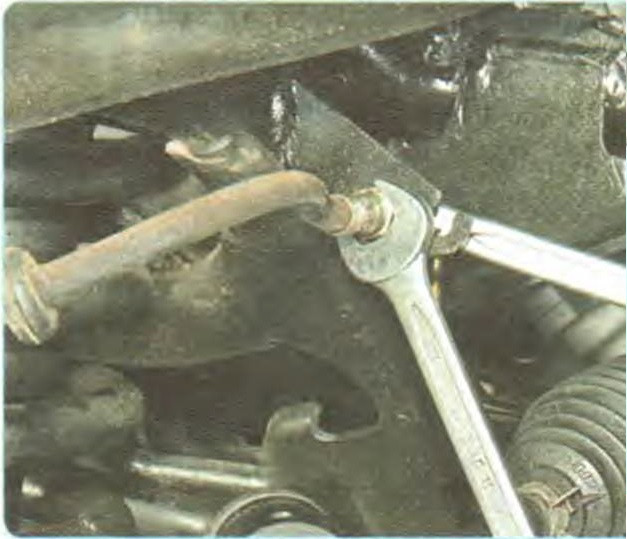 и специальны й ключ «на 12» для торм озны х трубопроводов. На автомобиле применяются три тормозных шланга: два к тормозным механизмам передних колес и один к тройнику на картере заднего моста. Работа показана