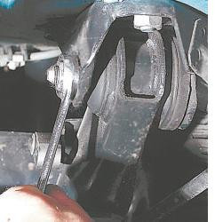 5. Відкрутіть з обох сторін по одній гайки болтів кріплення балки до кронштейнів, вибити болти і зніміть балку, викотивши її на колесах з ― під автомобіля.