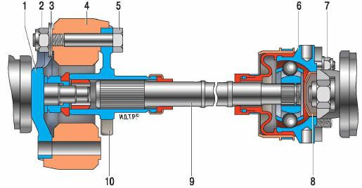 7 — гайка; 8 — заглушка корпусу шарніра; 9 — проміжний карданний вал; 10 — фланець еластичної муфти