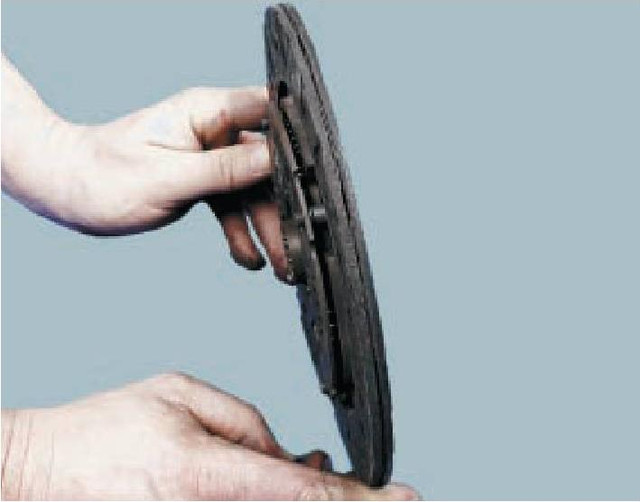 Огляньте робочі поверхні тертя маховика і натискного диска, звернувши увагу на відсутність глибоких рисок, зади-