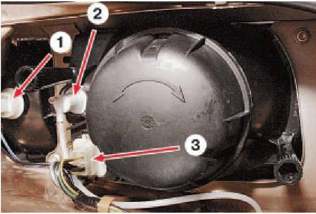 4. Натисніть на фіксатор і поверніть гідрокоректор проти годинникової стрілки до упору, після чого вийміть гідрокоректор з корпусу фари.