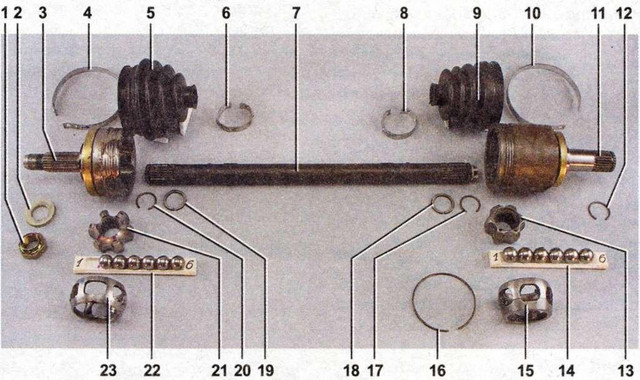 шарнира; 13 — внутрішня обойма внутрішнього шарніра; 14 — кульки внутрішнього шарніра; 15 — сепаратор внутрішнього шарніра; 16 — фіксатор внутрішнього шарніра; 17 — стопорне кільце обойми внутрішнього шарніра; 18 — наполегливе кільце обойми внутрішнього шарніра; 19 — наполегливе кільце обойми зовнішнього шарніра; 20 — стопорне кільце обойми зовнішнього шарніра; 21 — внутрішня обойма зовнішнього шарніра; 22 — кульки зовнішнього шарніра; 23 — сепаратор зовнішнього шарніра.