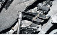 Головкою на 13 відвертаємо дві гайки кріплення поперечки коробки передач до кузова. При цьому задня частина коробки разом з муфтою трохи опуститься.