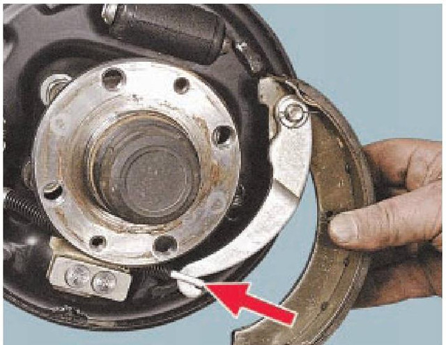 3. Вивісіть задню частину автомобіля, зніміть гальмівний барабан і задню гальмівну колодку