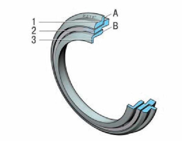 Перевірте стан синхронізаторів. При наявності відколів і забоїн на шліцах маточини і ковзної муфти, зносу сухарів і поломки пружини синхронізатор замінюють. Перевірте стан блокуючих кілець синхронізаторів. При наявності забоїн і сколів на зубчастих вінцях, значною вироблення на конусах блокуючі кільця замініть. При підборі кільця синхронізатора до конусам шестерень I, II, III і V передач, передачі заднього ходу і первинного валу, зверніть увагу на те, щоб кільця щільно, без гойдання прилягали до поверхонь конусів. Притрите кольца к конусам: поверхность контакта кольца с конусом должна быть не менее 80%. Наружное 1 (см. рис), среднее 2 и внутреннее 3 кольца двухконусного синхронизатора I и II передач притирают одновременно, после притирки они представляют собой неразделяемый комплект (также, как и притертые шестерни и кольца одноконусных синхронизаторов остальных передач). В сжатом под нагрузкой 10 кгс комплекте колец двухконусного синхронизатора несовпадение торцов А и В наружного и внутреннего колец от положения в одной плоскости должно быть не более 0,1 мм.