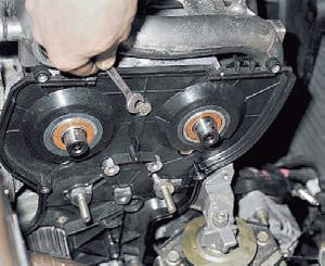 Ключом "на 10" закочуємо шість болтів кріплення задньої кришки приводу ГРМ...