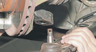 Спираючись монтажною лопаткою на поворотний кулак, віджимаємо вниз важіль передньої підвіски і наносимо удари молотком по вушку поворотного кулака до випресовки пальця кульової опори. Відвертаємо гайку кріплення пальця кульової опори...