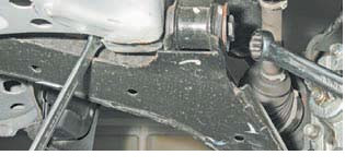 Головкою «на 14» відвертаємо два болти кріплення кронштейна подушки важеля до днища.