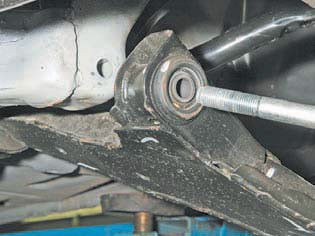 Накидним ключем «на 22» відвертаємо гайку болта кріплення сайлент-блоку важеля, утримуючи болт ключем того ж розміру...