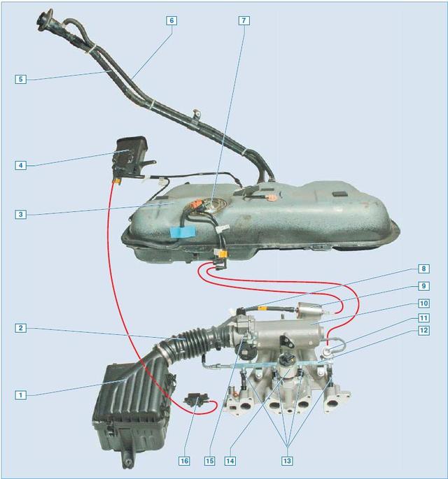 Елементи системи живлення двигуна: 1 — повітряний фільтр; 2 — гофрований шланг підведення повітря до дроссельному вузла; 3 — паливний бак; 4 — адсорбер; 5 — наливна труба; 6 — вентиляційна трубка; 7 — паливний модуль; 8 — регулятор холостого ходу; 9 — паливний фільтр; 10 — впускний колектор; 11 — регулятор тиску палива; 12 — паливна рампа; 13 — форсунки; 14 — клапан рециркуляції; 15 — дросельний вузол; 16 — клапан продувки адсорбера