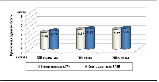 нію з фарами з РЛВИ відчуття дискомфортною блескости. Усереднені показники засліпленості показують також, що зовнішнє засліплення спостерігача вище, якщо в його власному автомобілі (автомобіль спостерігача) використовуються фари з ГЛН і його очі адаптовані до СРЭИ ГЛН. У зв'язку з тим, що продемонстровані відмінності