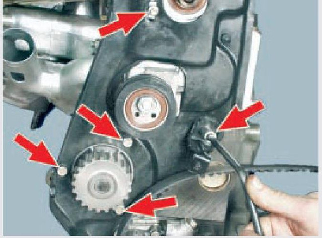 Розташування точок кріплення задньої кришки привода розподільчого вала та водяного насоса.