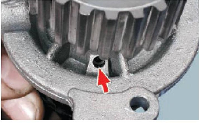 7. Відведіть убік задню кришку та вийміть водяний насос, підчепивши його викруткою за зубчастий шків.
