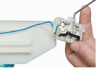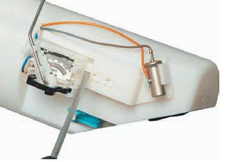 ...і знімаємо датчик покажчика рівня палива, виводячи його провід через отвір в корпусі модуля.