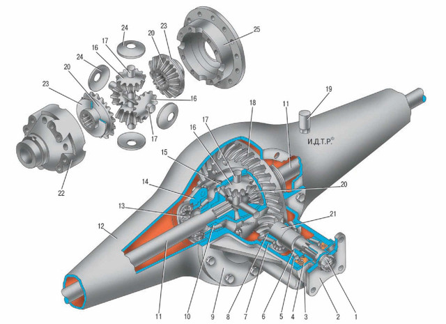шестерня; 21 - ведуча шестерня; 22 - права частина коробки диференціала; 23 - шайба полуосевой шестерні; 24 - шайба сателіта; 25 - ліва частина коробки диференціала.